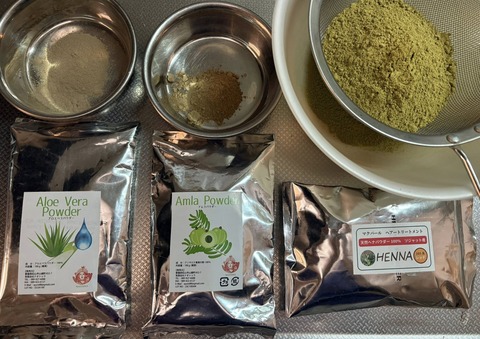 昨日の顧客様の ヘナレシピヘナに対して 10%のハーブアロエベラパウダー、アムラパウダーを それぞれ5%頭髪の張り 艶 育毛対策にアムラ頭皮···