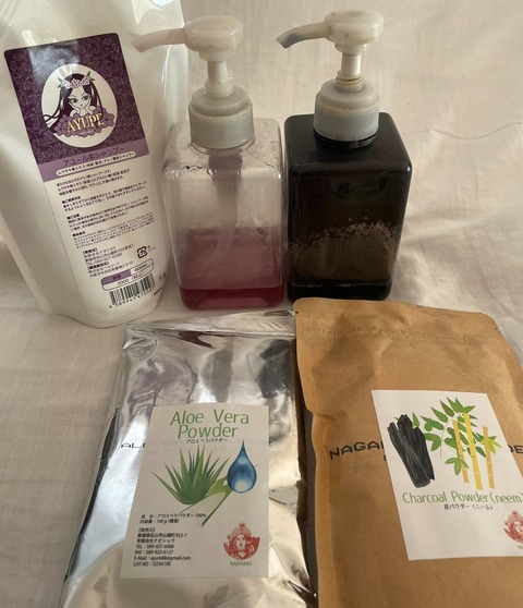 紫根シャンプーで ハーブシャンプー創り季節は乾燥する冬 しっとりと元氣にさせたい心持ち今回は ニーム炭 と アロエパウダー で手作りしました···