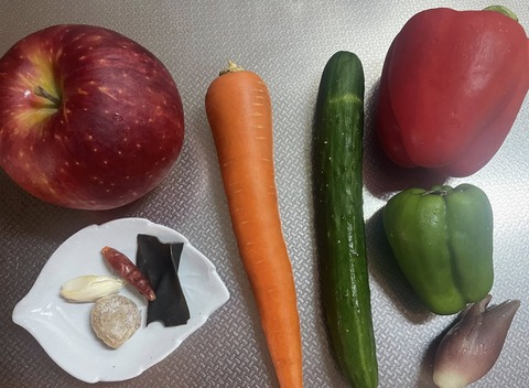 こんな材料で 水キムチ 作りリンゴ 人参 キュウリ パプリカ ピーマン 冥加冷蔵庫に残っている野菜で良いようです セロリなどもいいですね大蒜···