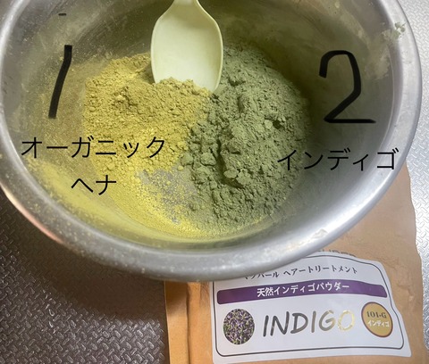 頭髪の赤色少し氣になる程度想いついて 午前中インディゴ実践おうちヘナは目検討重さをはかったりもしない スプーン計量で インディゴ2:オーガニ···